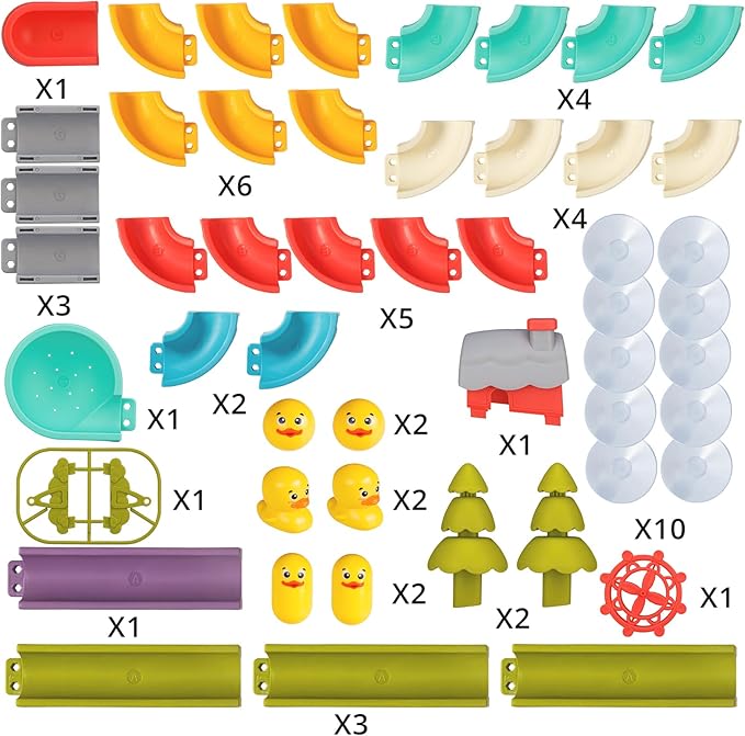 - 【DESIGN IT YOURSELF】There are 51 pieces in this bathtub toy set, including the suctions and the ducks. Yet you can design the tracks in many turns or straight, up or down, left or right. Do it with your imagination! Creative bath toys for toddlers age 3+