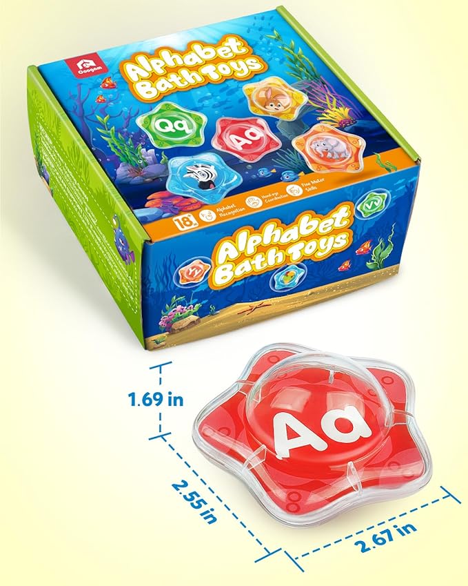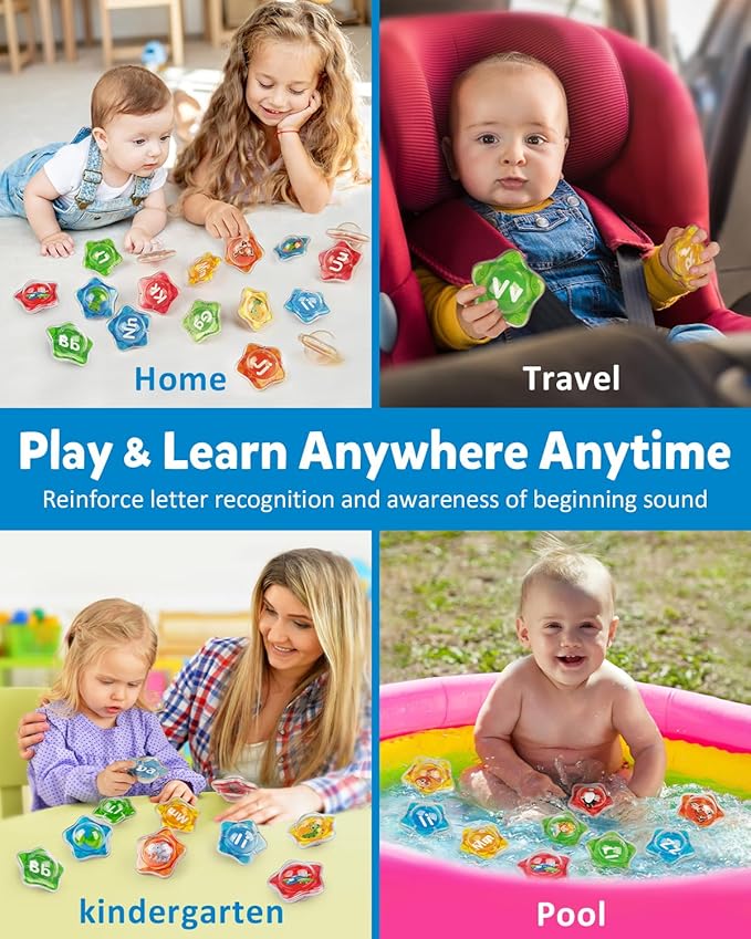 - Learn Alphabet at Bath Time: This cute alphabet bath toy set is a fun activity that helps toddlers develop fine motor skills and learn letters. Colorful letters and pictures are printed inside these waterproof toys, they are perfect for parents to entertain and educate their kids during bath time.