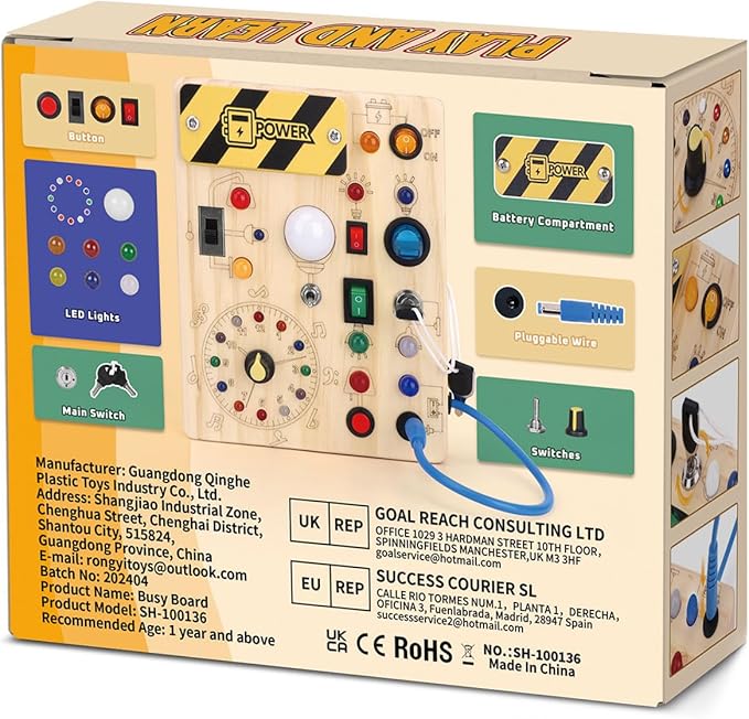 - Elaborate Design - This busy board is made especially for young children who like playing with switches and LED lights. On this busy board, there are 10 separate switches, and each switch relates to a different color or style of LED light. Each LED's brightness is set to be just right for the infant-not too bright, blinding, or dark to see well.A master switch is set up to turn off all LED lights with one click to avoid wasting power.