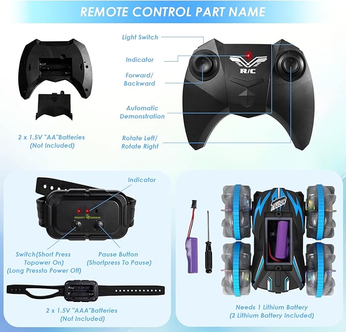 - 【Two Remote Controller & Colorful LED Lights】The rc car comes with two remote control control, By moving your arm or twisting your wrist, the rc car can perform 360° stunts effortlessly and your kids can enjoy more driving pleasure with gestures. The amphibious rc car is designed with colorful LED lights, bring amazing operation experience and visual effects, cool functions and unlimited fun to kids.