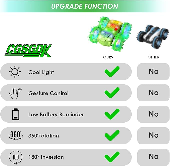 - 【Two Remote Controller & Colorful LED Lights】The rc car comes with two remote control control, By moving your arm or twisting your wrist, the rc car can perform 360° stunts effortlessly and your kids can enjoy more driving pleasure with gestures. The amphibious rc car is designed with colorful LED lights, bring amazing operation experience and visual effects, cool functions and unlimited fun to kids.