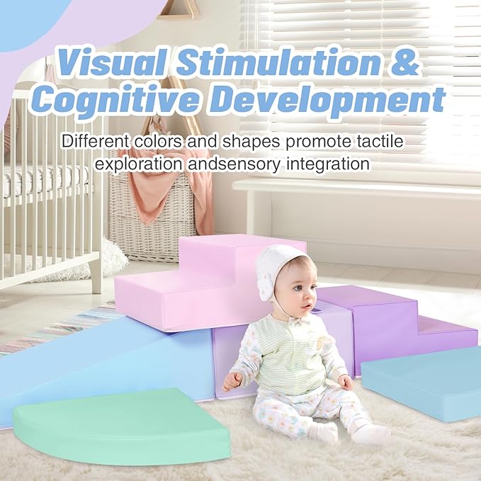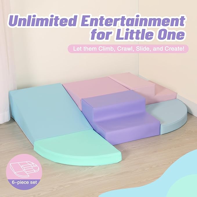 - ★ 【6-Piece Set】 Baby climbing blocks consists of 1 pink stair, 1 lilac purple stair, 1 azure blue half-moon, 1 lake green half-moon, 1 purple square and 1blue slide. This soft play equipment stimulates your child's imagination to create endless combinations of structures, allowing them to enjoy the fun of the toy as they climb up and down, stacking and swapping four different shapes.