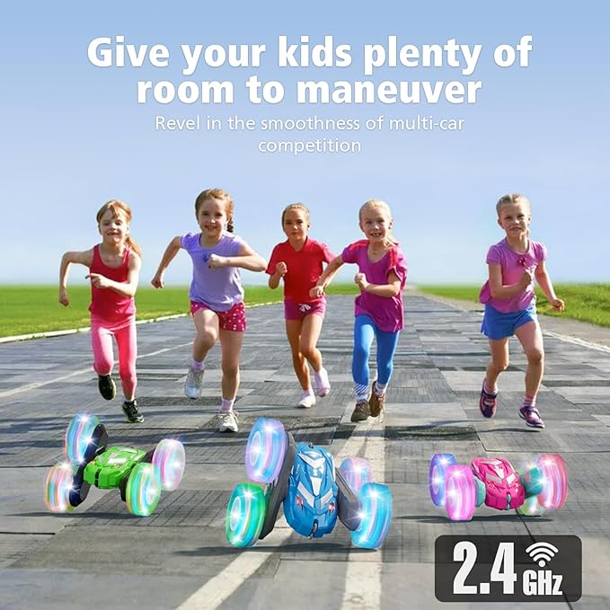 - [Thrilling & Stable Race Car Game Experience]-Speed, always an important consideration for car toys for boys age 6-10. Equipped with 2 motors, this car is built for incredible speeds. 2.4Ghz ISM band, strong anti-interference, 30m long transmission distance promise rc control car stable remote performance. Remote controlled car having those features allow kids to play together with their fellows. 360 degree spins & double sided flip stunt, make it rise to prominence in rc toys games.