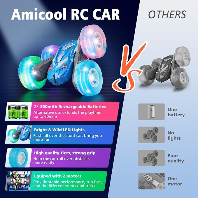 - [ Cool & Wild Lights - Drive Day & Night ]-Amicool remote control car features dazzling, multicolored LED lights in its wheels, which are a creative take on the LED headlights design. This mini remote control car will bring you easy & smooth driving as well as glittering & brilliant visual enjoyment, and definitely makes it much easier to track your RC vehicle at night.