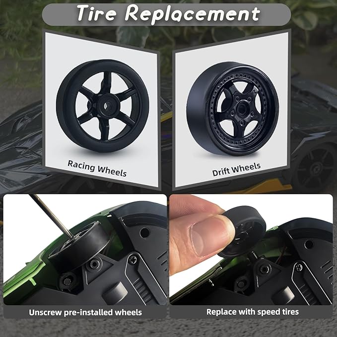 - Tire Configuration: Drifting car comes with 4 speed racing tires and 4 drift tires. When you want to show off this high-speed RC drift car with stunts, you can drift on smooth boards, tiles, tracks with better handling and good agility, and when you want to make it a sports car, the racing tires will be your better choice. One toy car double fun