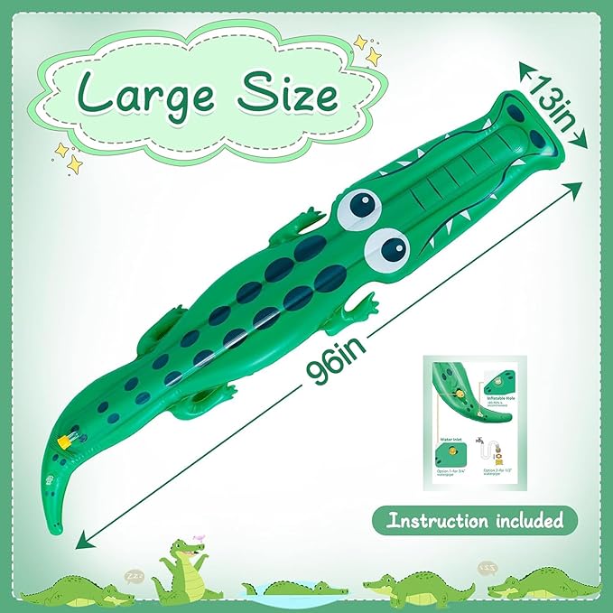 96" x 13" Extra Large Crocodile Sprinkler for Kids - Outdoor Toys Kids Toddler Water Sprinkler for Yard, Attaches to Garden Hose, Durable Inflatable Splashing Fun Toys for Garden Lawn