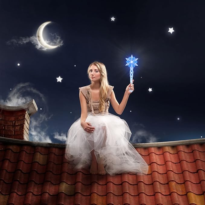 - EYE-CATCHING LIGHTING: These magic wands are full of fascinating light effects, press the button, the snowflake of the wand top will change 6 different colors