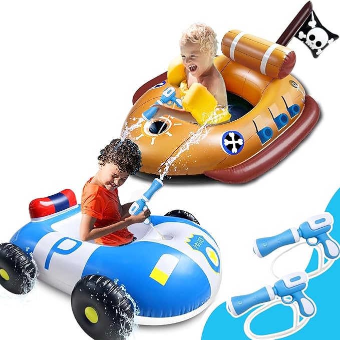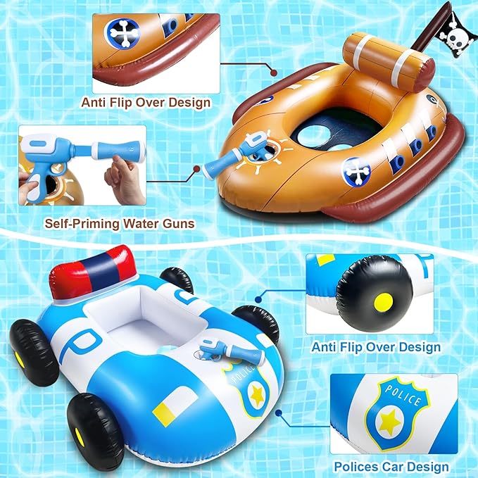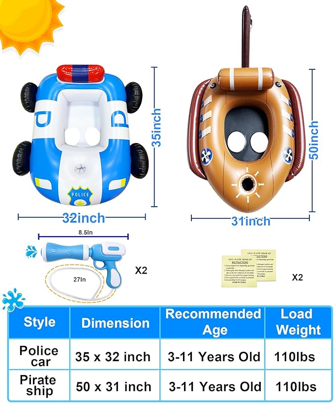 - 2 Pack Police Car & Pirate Ship Pool Float with 2 Water Guns: Package includes 2 pack police car & pirate design kid inflatable pool float with 2 water guns, and 2 repair patches. Police car size:35inch*32inch(L*W),Pirate ship size:50inch*31inch(L*W), suitable for children 3-11 years old, no more than 110 lbs