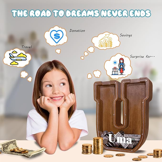 • 🎁️UNIQUE CUSTOMIZED PERSONALIZED GIFT: Beyond choosing a initial piggy bank with the corresponding initial for family or friends, you can personalize it further by engraving unique messages or name on the personalized wooden piggy bank. The acrylic panel can be adorned with exclusive drawings using water-based markers. A perfect gift for kids, newborns, boys and girls of any age, for Baby Shower, Children's Day, Back to School , Thanksgiving, Christmas, Birthdays etc