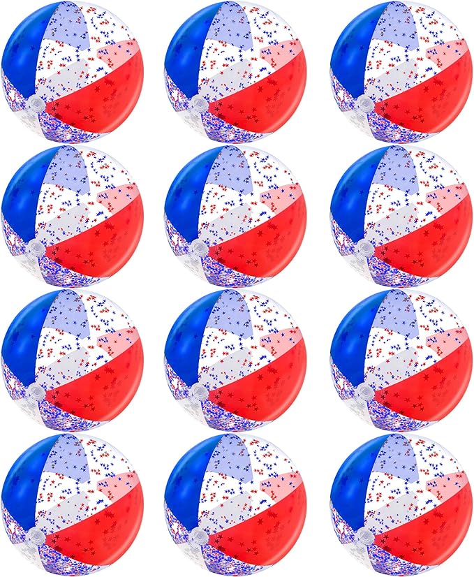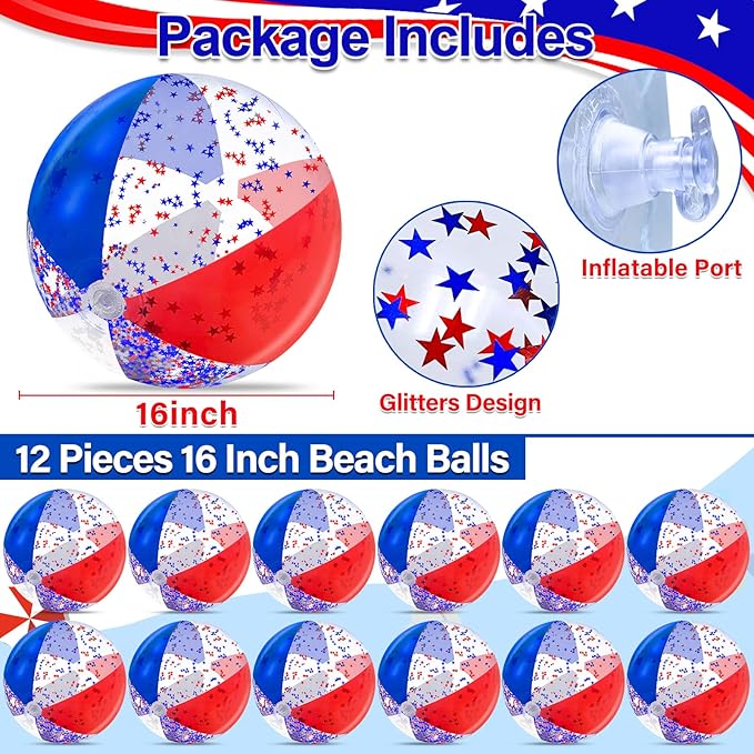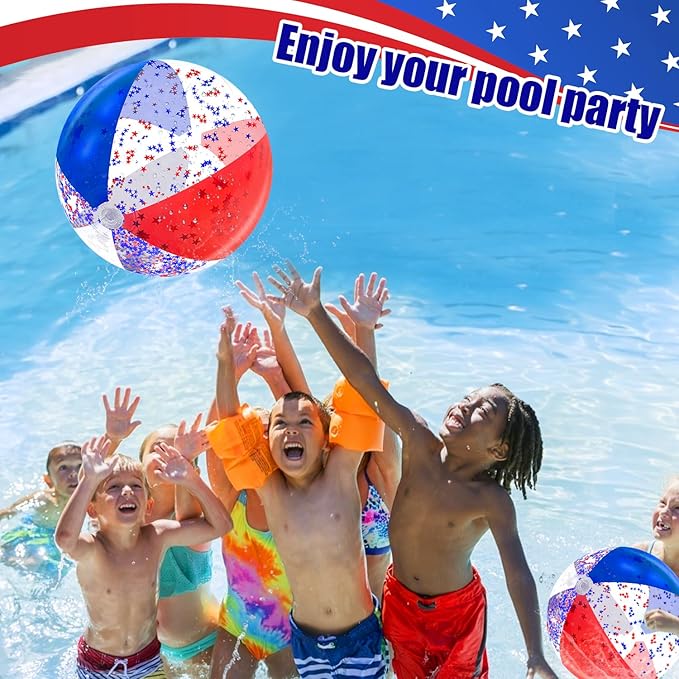 - 【12 Pack 4th of July Glitters Confetti's Beach Ball】12Pack 16 inches Patriotic Glitters beach balls in total,,easy to fold after deflate, this giant inflatable Glitters helps the world come alive for your children, which can satisfy different people needs of playing even as decoration. (Note: Adult supervision all the times when children are using in the water, pool or beach. Babies usually does something unexpected, so don't let your baby play alone.)