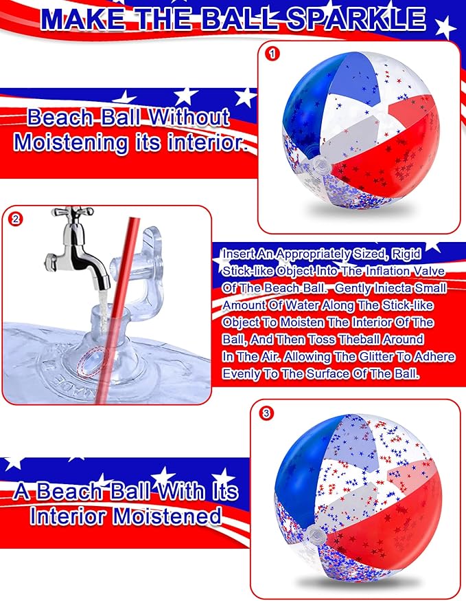 - 【Easy to Install】4th of July sequins inside the ball are loose, not fixed on the beach ball. After you blow up the ball, add a couple of drops of water to the inside of the ball and then toss the ball around in the air, and than glitters confetti's sticking to the entire interior. Easy to inflate an deflate, can be folded to easy storage and carry around.