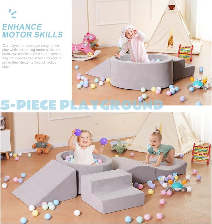 - ❤Complete 5-Piece Set❤ The playset Includes 1 stair climber, 1 ball pit (balls not included), 1 triangle wedge, and 1 versatile cube that splits into two for creative play.It suits for kids or toddlers aged 1-3 years old to safely climb with different levels of difficulty
