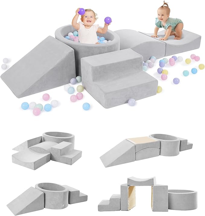 Foam Climbing Blocks with Ball Pit Designed for Toddlers Aged 1-3 -Great for Indoor Crawling, Inside Foam Playground Set for Little Ones to Active Playing -(Balls NOT Included) Grey