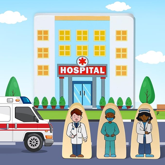 - Wooden Character Set - A must-have for little boys and girls that love playing people toys. Comes with an assortment of about 28 pieces wooden occupations blocks, 4 trees and 4 pieces wooden play sites including hospital, school, police and fire station. Let your children create an imaginative community with unlimited play possibilities