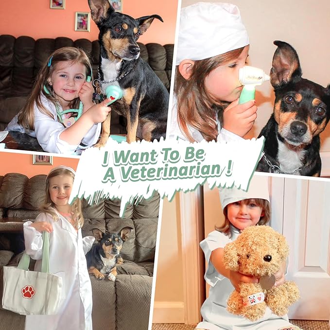 - ABUNDANT DOCTOR TOYS: Our vet play sets for kids comes with storage bag, doctor costume, doctor hat, dog toy, pet comb, scissors, glasses, stethoscope, protective collar, pill bottles×2, dental mirror, otoscope, flashlight, thermometer, syringe, stickers×10. Please let us know if you have any issues