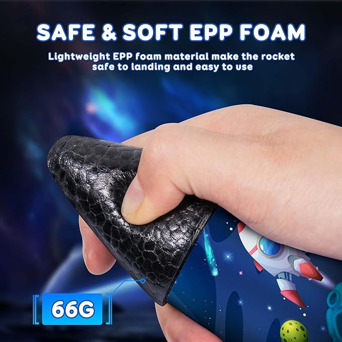 - Safe landing Rocket Launcher for Kids: The rocket's shell is made of EEP foam material, and its light weight greatly improves its launch altitude. When the rocket toy flies to a certain height, the parachute will open automatically and land slowly. The parachute + EEP foam material shell allows you to not worry about the possibility of the rocket breaking or kids hurting when landing!