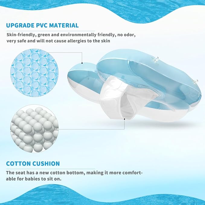 - 【Safety Design】① Designed with a double-layer air chamber, heightened and widened all around to prevent the baby from leaning forward, tipping over or slipping out. ② Two PVC adjustable straps fix the baby's position, and a new outer layer is added to prevent scratching the skin. ③ There are two small air bags on the belly of the swimming ring to support the baby, making it easier to play. ④ The swimming ring seat is added with a cotton sandwich to make it more comfortable for children to use.