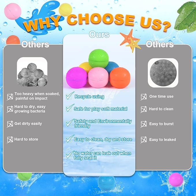 - Recyclable and Environmental Protection Materials- 98K water ball toys can be recycled and easier to clean and store, reducing the effort of cleaning up garbage after playing. All better than sponge balls and traditional disposable water balloons.