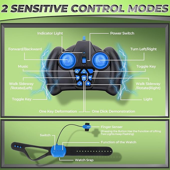 - [Play With Gesture] Gesture sensing RC stunt car with 2.4Ghz gesture sensing watch control for fast response. Support multiple toy cars racing at the same time. Just put on the sensing watch, and the hand controlled car will follow moving when your fingers dance
