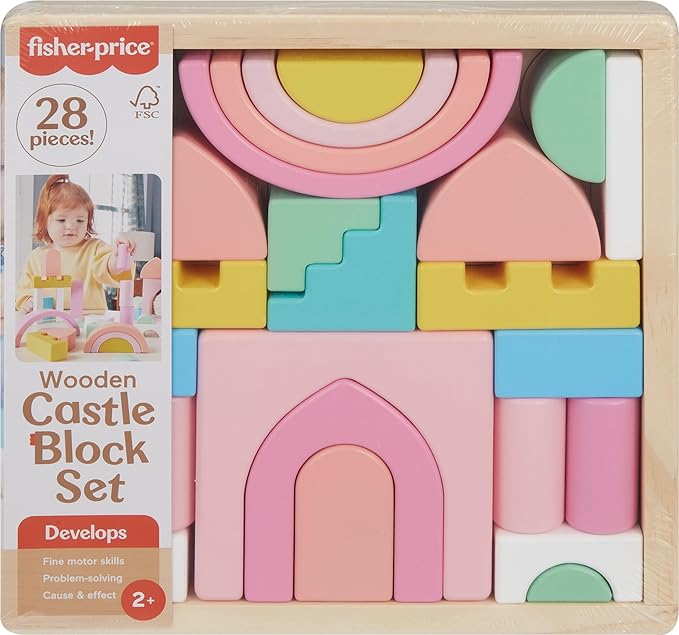 Fisher-Price Wood Toddler Toy Castle Block Set, 28 Wooden Pieces for Stacking Developmental Play Preschool Kids Ages 2+ Years