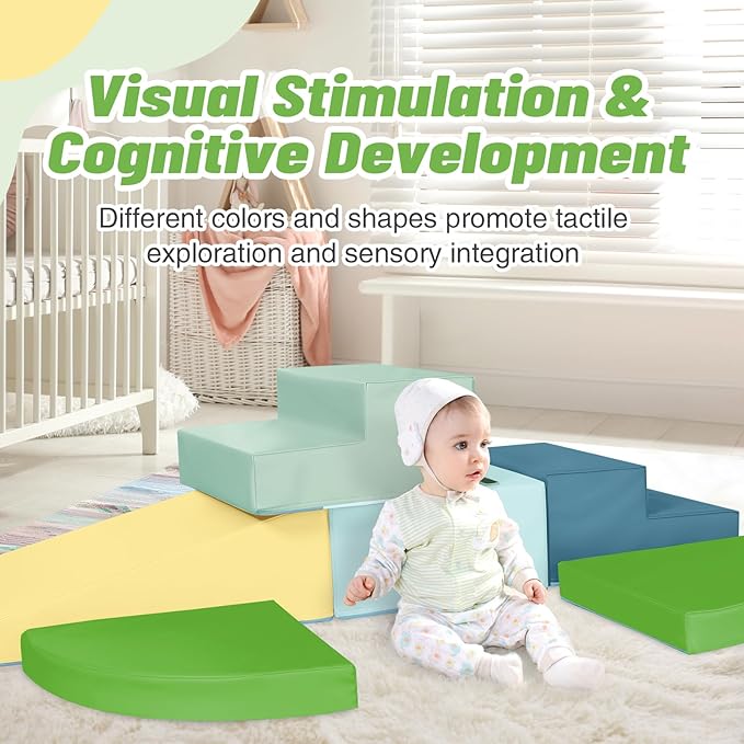- High-quality Safety Materials: Crafted from environmentally friendly soft cotton and soft PU leather, ensuring safety and durability for your little one. Our toddler climbing toy 6-Piece Set includes 2 stairs, 2 half-moon, 1 square and 1 slide. Non-toxic, odorless, and easy to clean, this foam climbing toy provides peace of mind for parents