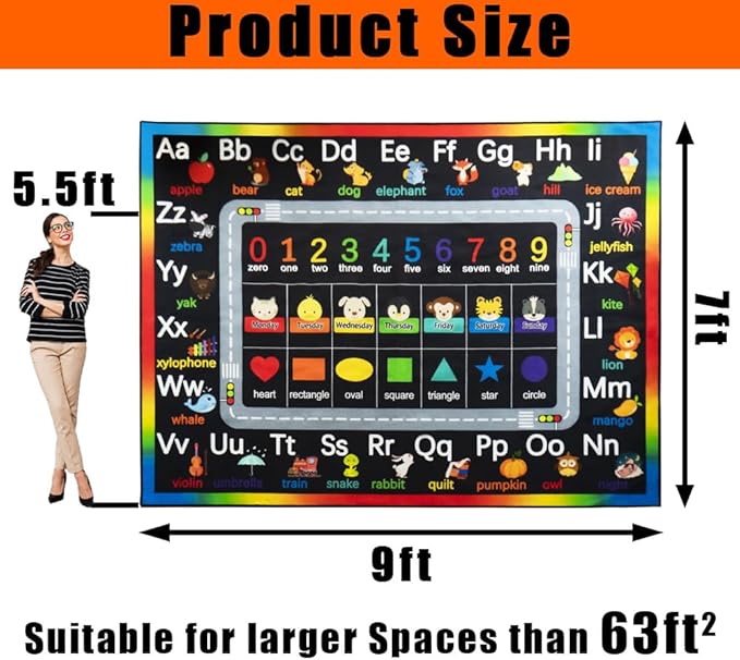 - AlaTyche Classroom Rug - For all types of classrooms! It measures 6'7''x8'7'' and features 26 brightly coloured alphabet, many shapes, words and weeks, and a variety of unique coloured shapes around the edges. Provides ample room for about 10 children to move around. Our bright and vibrant shades inject a splash of personality into your learning space, creating a lively and fun environment for your students.