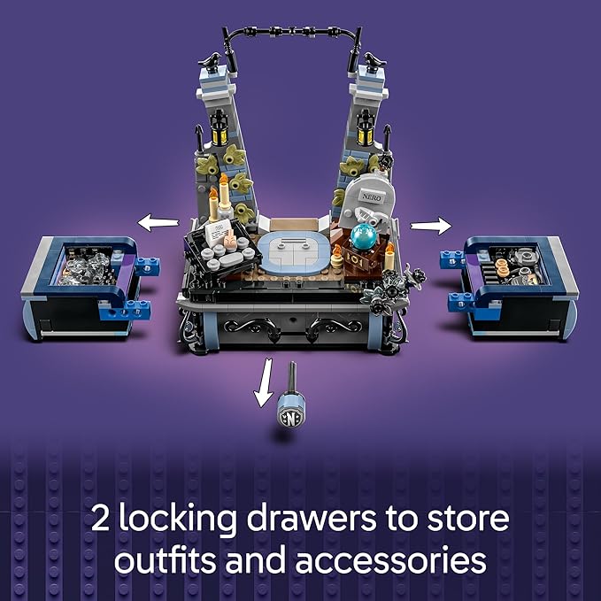 - MYSTERY PLAYSET WITH SECRET ACCESSORIES – Includes a brick-built figure of Wednesday with 2 face and outfit options, Thing character, a stand with 2 secret lockable drawers and various accessories
