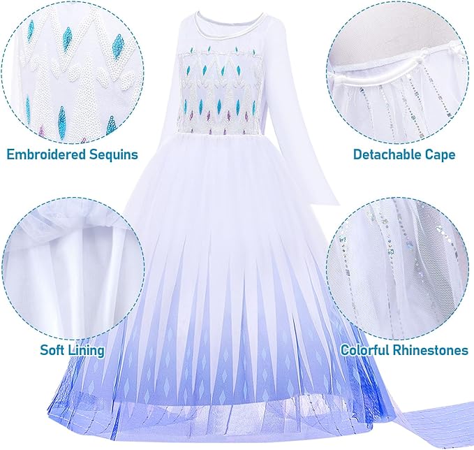 - 【Exquisite Design & Unique Details】---This Princess dress features exquisite detailing with a detachable floor-length sequined tulle cape, sparkling accessories and delicate lace. Dreamy ombre skirt makes your little girl look like a real princess. Designed with an elastic waist and soft cotton lining to prevent exposure, it is the best princess dress-up costume for little girls