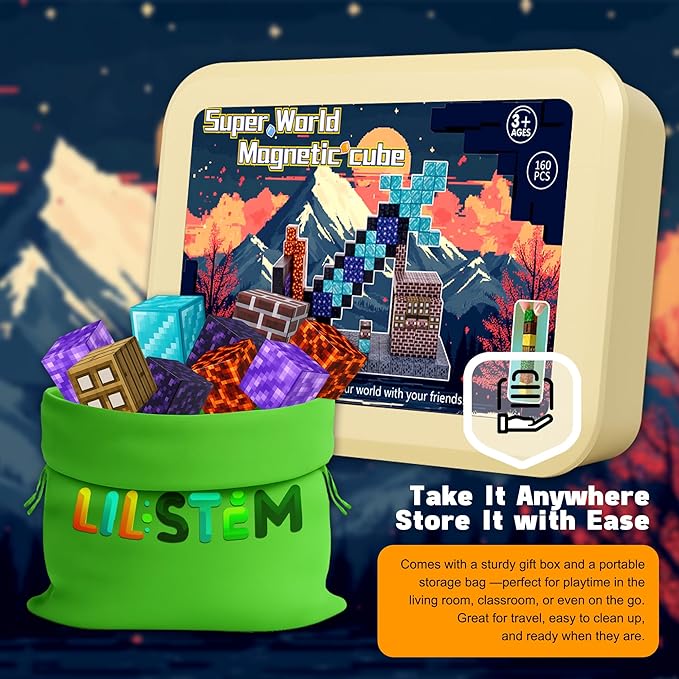 - SWORD WORLD, 160PCS QUEST— Pixel-style terrain, lava pillars, a forge and a giant blade start the story. These kids building blocks keep play screen-free; magnetic blocks for kids click fast and magnetic building cubes stack tight for bold angles.