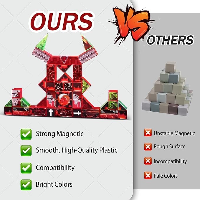 - SKILLS THAT GROW— Turn simple stacks into planned scenes that test balance and symmetry. These kids building blocks build fine motor control and focus; magnetic blocks for kids click smoothly, and magnetic building cubes support safe height, span and stability practice.