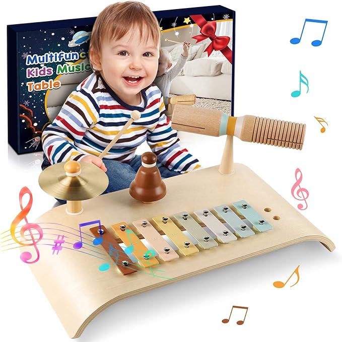 - 🎵Montessori Toys for Toddlers:You will love this awesome musical activity table that introduces little ones to the world of music! An super fun activities to help develop the child’s senses of rhythm and melody by listening to the natural sounds of wooden music kit .