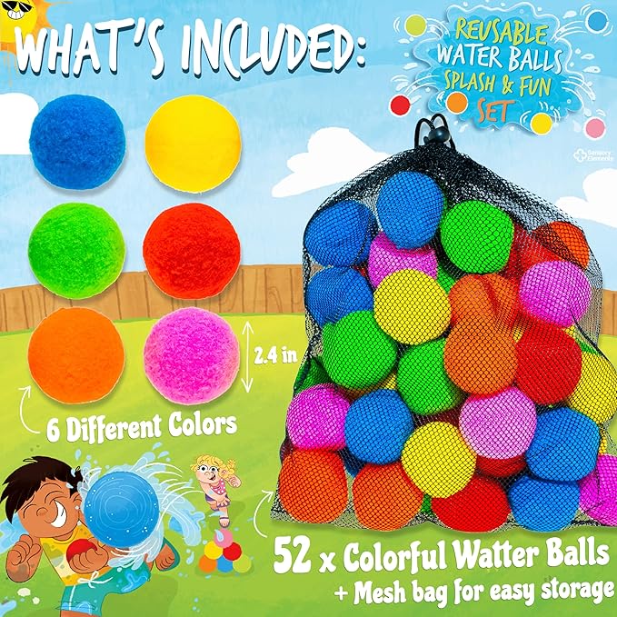 Reusable Water Balls Splash & Fun Set- 52 Colorful Cotton Splash Balls for Kids - Perfect for Outdoor Summer Fun, Pool Games, Water Play, Backyard Play, Perfect Water Toy Gift for Kids - Ages 5-12+