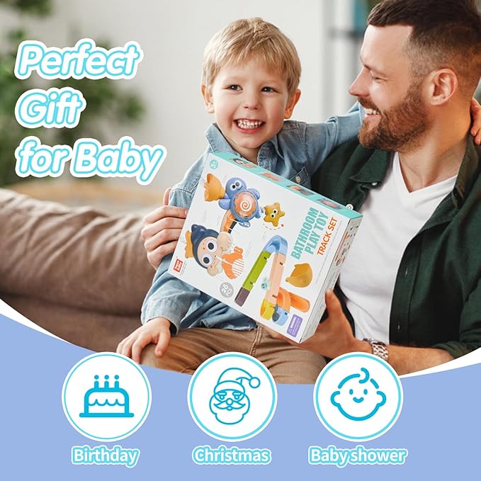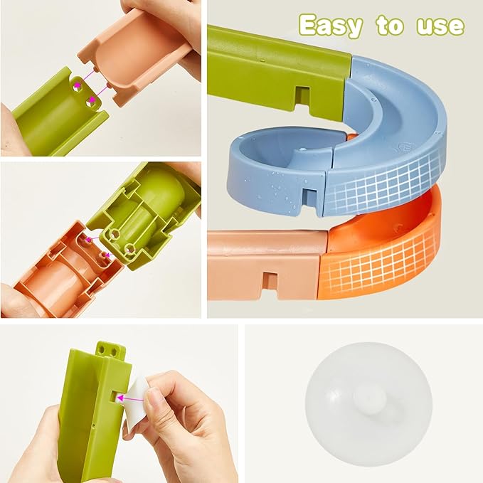 - Fun Bathtub Slide Toy for Toddler: This great kids bath toys contains 10 assembly tracks divided into three models ABC, 1 waterfall station toy, 1 Whale bath cup, 2 spinning water wheels, 8 suction cups and 4 other cute and fun small parts, so that your kids can DIY different track shapes by themselves and inspire their imagination, creativity and hands-on skills. Bright colours and rolling ball attract your child's attention, your toddler may try to catch it before it falls into the bathtub. Creative bath toys for toddlers age 3+.