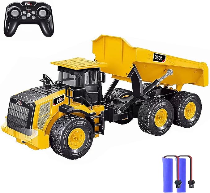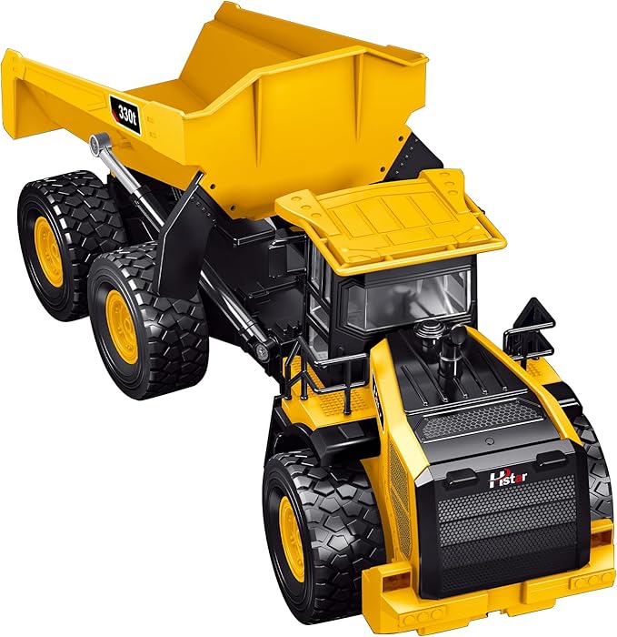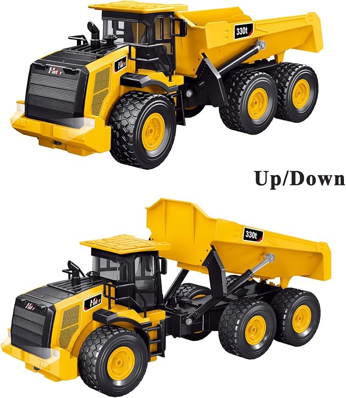 - Articulated Dump Truck:The cab roof is made of high-density material, both the appearance and texture are highly simulated. The bucket can be controlled individually, and the bucket can rise up to 65°, simulating the remote control unloading of a real car, allowing children to enjoy a lifelike driving experience.