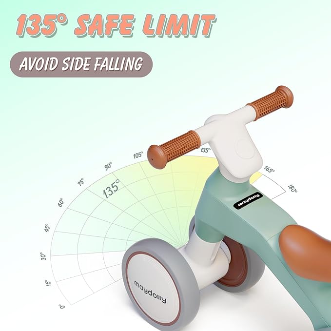 - 【SAFETY FIRST】135°steering limited and low center of gravity to avoid side falling. No pedal and fully widened closed wheel to avoid clamping baby's feet. Our toddler balance bike is designed with safety first in mind! You can have peace of mind when guiding your baby on a bike.