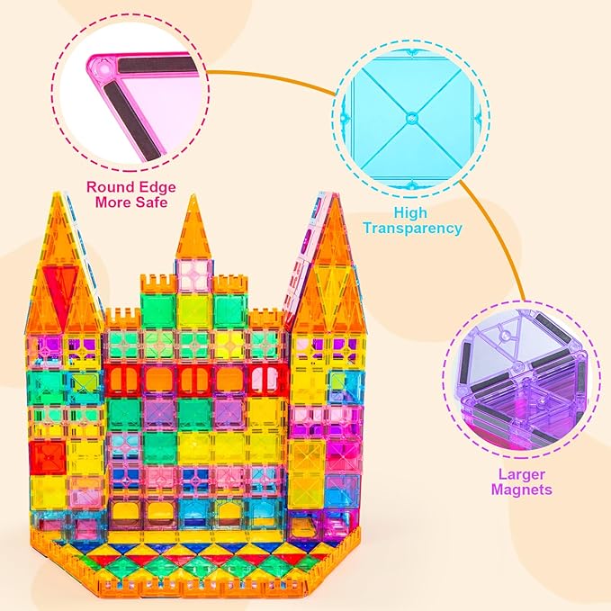 - Material quality: made of ABS plastic, no smell. ASTM-approved STEM toy, safe for kids to play, colorful magnetic building tiles, smooth surface like ice. High transparency,round edges, not easy to scratch.Building with these magnetic tiles helps children develop problem-solving skills, spatial reasoning, and fine motor skills in a fun and engaging way.