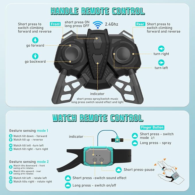 - 【2 Batteries for Hours of Fun】 2 rechargeable batteries (3.7V 500mAh)*2 provide long-lasting fun. Stay away from screen and play the car toys with colorful lights and cool spray. The remote uses two "1.5V" AA batteries (included). The gesture remote uses two "1.5V" AAA batteries (included).