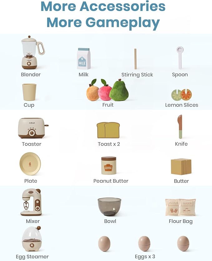 - Complete Kitchen Toy Set: Equip your mini kitchen with essential appliances for every cooking adventure. This set has everything from steaming eggs to mixing batter and toasting bread.