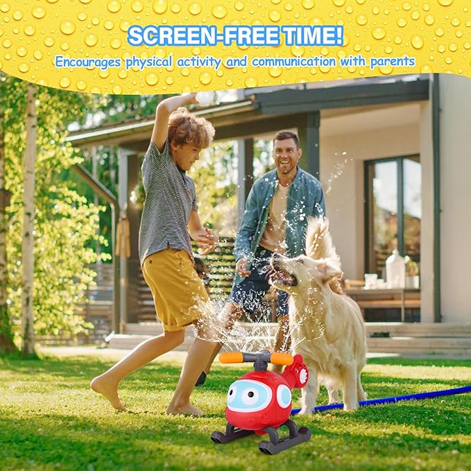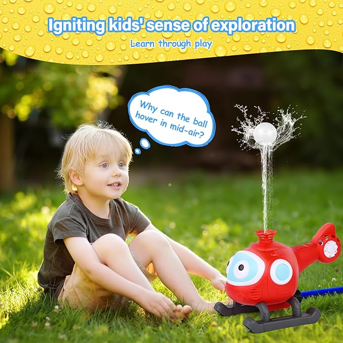 - Easy Setup, Double Fun: Place the ball, turn on the valve and watch the ball rise and float in the air, to the kids' amazement. Then, use the bat to hit it! It's perfect for training kids' t-ball skills, and dogs who love fetch will dash to retrieve the ball. Or, swap to the sprinkler head, and cool water will fly through the air with the spinning propeller, keeping your kids or dogs cool and busy.