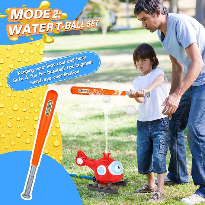 2 in 1 Outdoor Water Toys, Sprinkler for Kids Helicopter Tee Ball Set Kids Water Toys, Toddler Summer Toys Backyard Games for Kids Ages 3-12, Baseball Gifts Outside Toys for Toddlers Boys, Girls