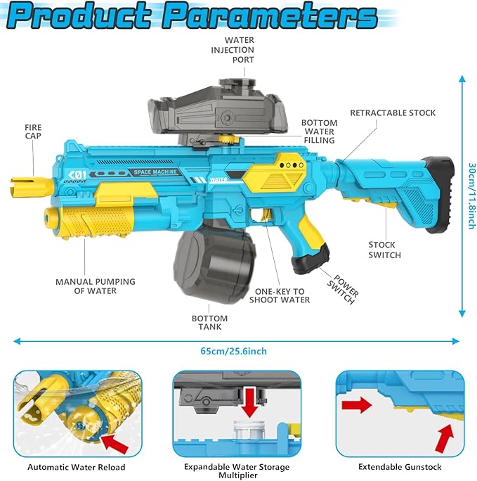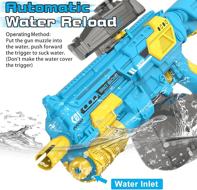 - [Automatic Water Suction Design] Our electronic water gun adopts electric water suction function, no need to add water manually, no need to disassemble, very convenient. The newly improved water filling method, after turning on the power, just put the water gun muzzle into water, press the trigger forward to immediately start pumping water, and it takes 15 seconds to fill water. In addition, you can also quickly add water directly from the water filling port.
