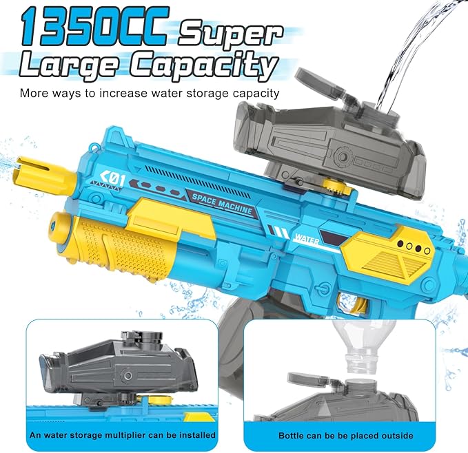 - [Great Gifts] The powerful water guns are made of high quality ABS plastic, safe and durable. The body of the water gun is smooth and comfortable with no sharp edges. The cool and technical appearance will be deeply loved by both adults and children. Whether in your garden, swimming pool, beach sand water fight or water party, electric water guns will create precious memories for kids and parents!