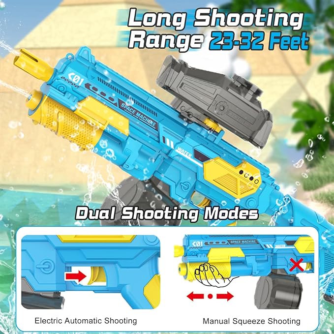 - [Electric & Manual Water Gun] Our electric water gun breaks away from the previous sigle mode and has 2 modes: electric shooting and manual shooting. The water gun can add water electrically, shoot continuously, have high shooting speed and powerful impact. Just pull the trigger to shoot water continuously. When the battery is empty, turn off the power to use the manual mode pull to shoot. You can enjoy long hours of fun water fight with your friends and family!