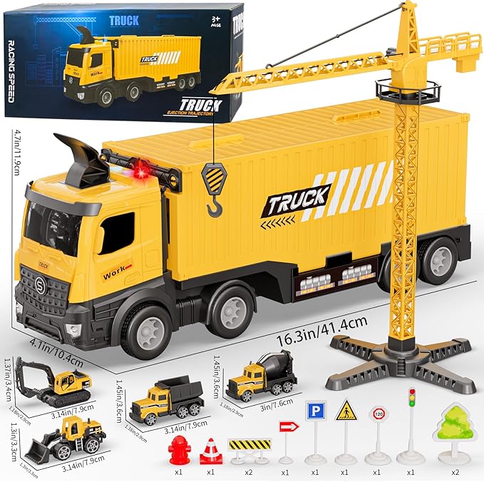 - 3-in-1 Carrier Semi Trailer Truck Toys - This transportation truck features a foldable design with ejector track container truck and alloy construction vehicle, your child will see cool lights, hear the sound of the vehicle starting, the sound of the horn, the realistic police sound and the pleasant music.this transportation truck has 8 parking spaces on both sides of the truck for easy storage of die-cast cars for children.