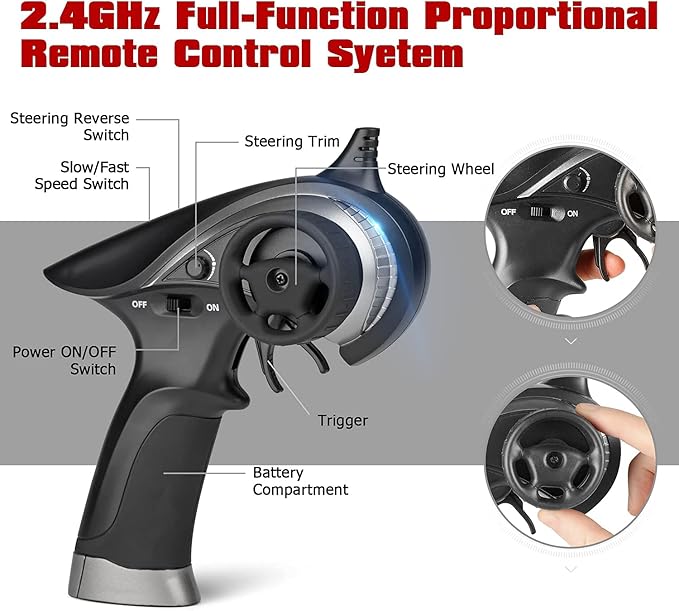 - 【Full-Function Radio System】Powered by an enhanced 380 brush motor, this remote control truck reaches speeds of up to 36km/h. The full-function proportional 2.4GHz radio control offers a range of 280 feet, allowing for seamless control without signal interference, even when racing with friends. Plus, a normal/slow speed switch is perfect for beginners and children.