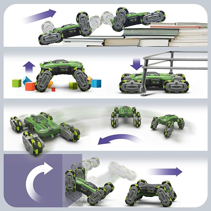- 8WD RC Stunt Car: This remote control car features a powerful 8-wheel drive system and 4 responsive control arms, effortlessly following both remote and gesture commands. It scales small steps, thresholds, and books with ease, shuttling smoothly under cabinets, beds, and coffee tables. The hand controlled RC car also delivers impressive stunts, including dual-sided driving, acrobatic flips, and 360° spins. A cool gift for 6 7 8-12 year old boys