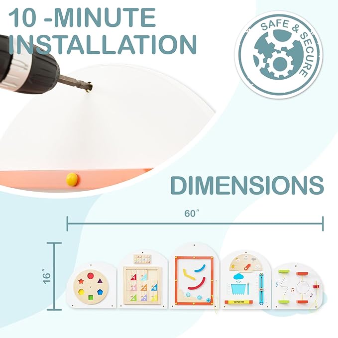 - READY TO PLAY: Our wall sensory board arrives fully assembled and features a simple wall-mount design that can be set up in under 10 minutes, providing instant access to educational fun. Dimensions: 54L x 28W inches