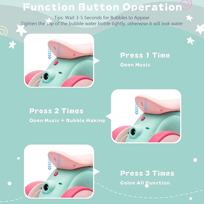- Ensuring Safety First: Our electric baby balance bike with bubble maker ride on toy not only promotes fitness and balance in young children but also encourages babies to utilize their legs, thereby strengthening leg muscles and establishing healthy exercise habits from an early age. It fosters balance, coordination, self-confidence, and independence. Featuring a lower floor-to-seat height, even the smallest tots can enjoy a smooth and secure ride-on experience.