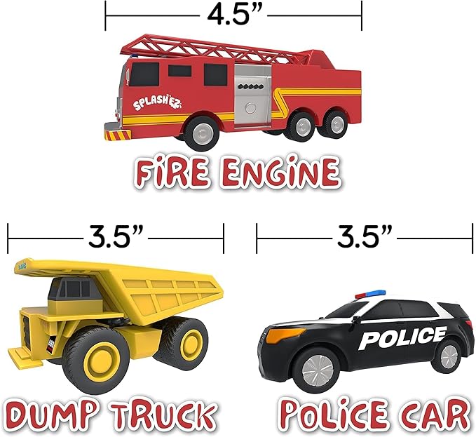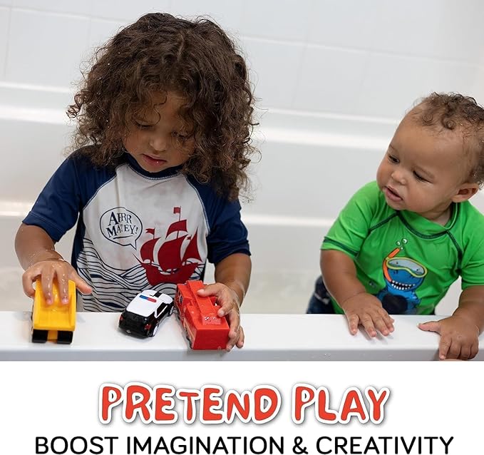 - A WILD TIME – Make water play wildly fun with SplashEZ no mold bath toys! Your baby bath 12 18 months set includes 6 cool vehicles - a fire engine, a police car, an ambulance, a junk truck, a school bus and a dump truck!