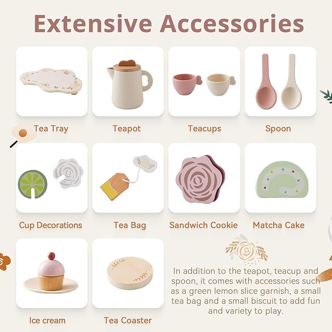 - Thoughtful Gift: This pretend play tea set makes a timeless and considerate gift for young girls and boys. The set offers endless opportunities for imaginative play and growth, and is perfect for birthdays, holidays, or any special occasion. Give the gift of fun and creativity with our wooden tea set